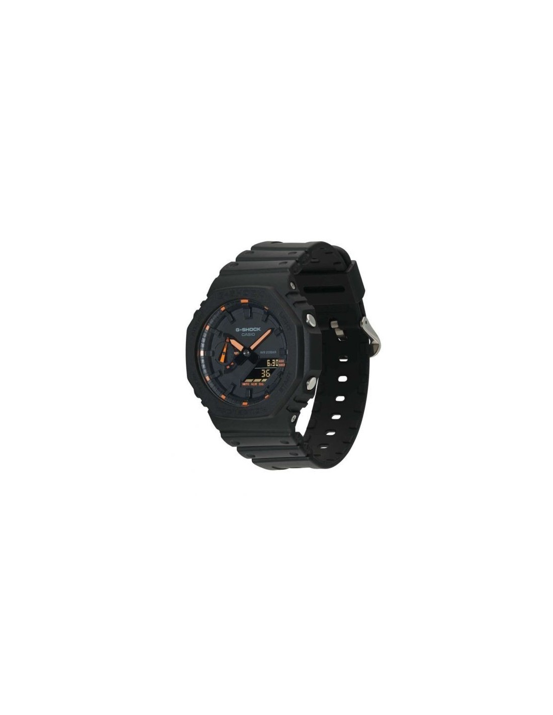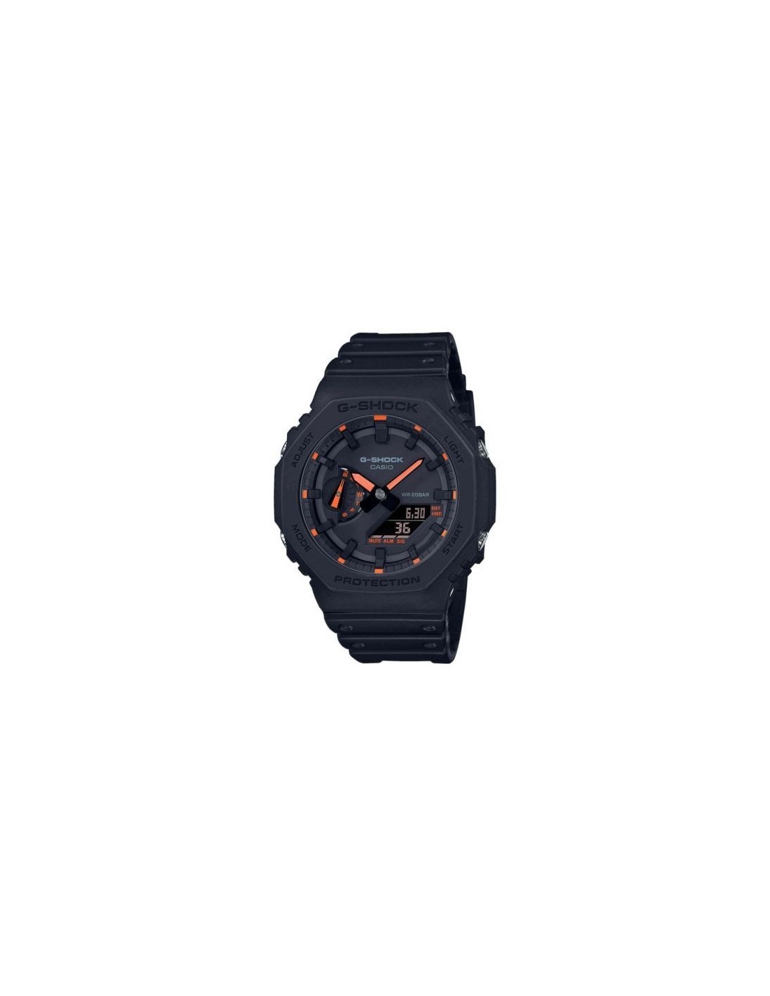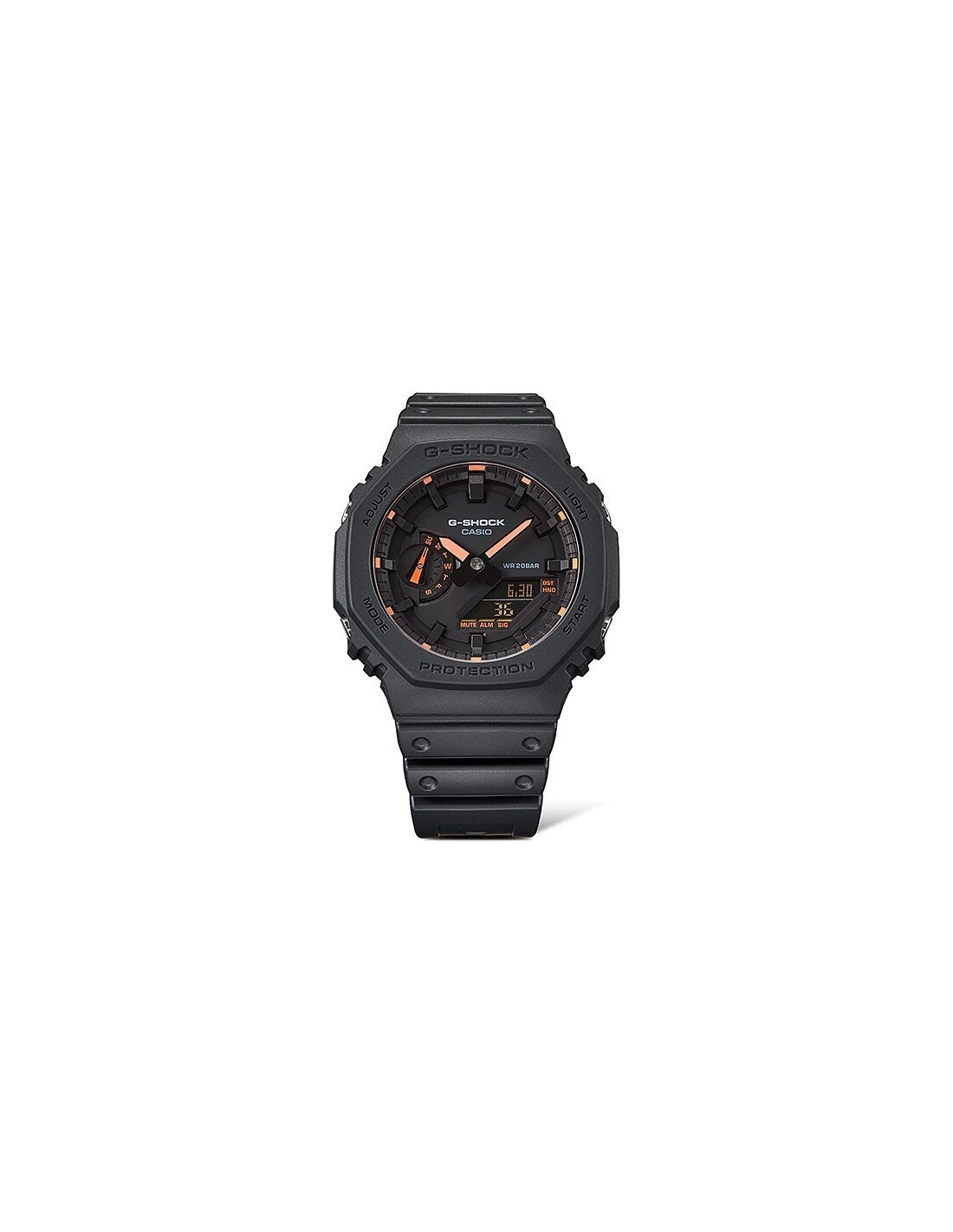 Con un fondo negro mate, esta versión del popular modelo GA-2100 resalta el dial de naranja consiguiendo un acabado único.