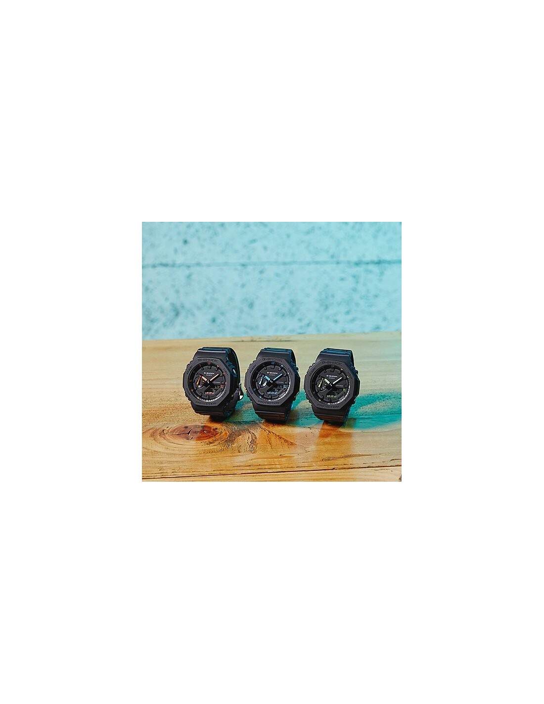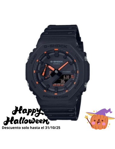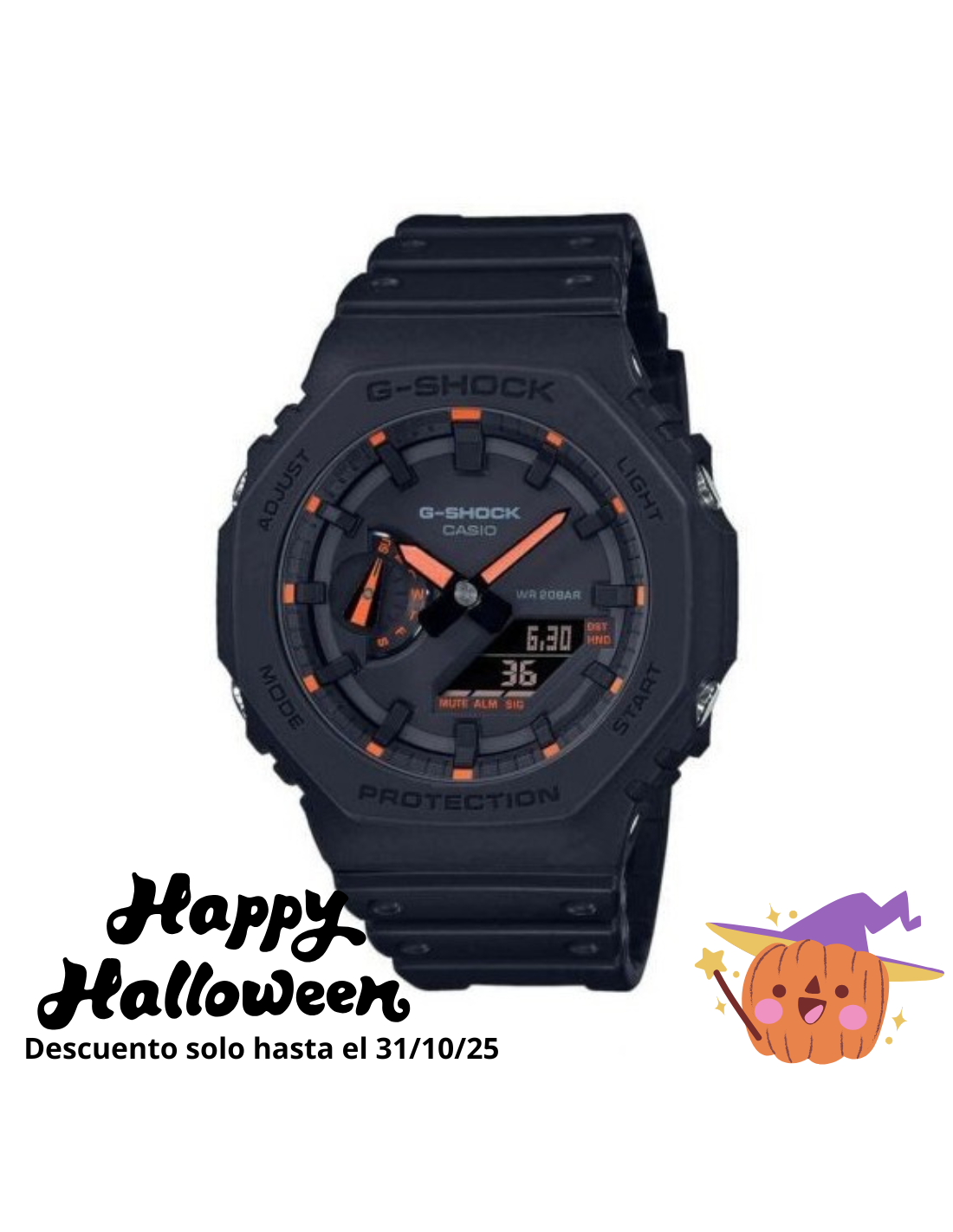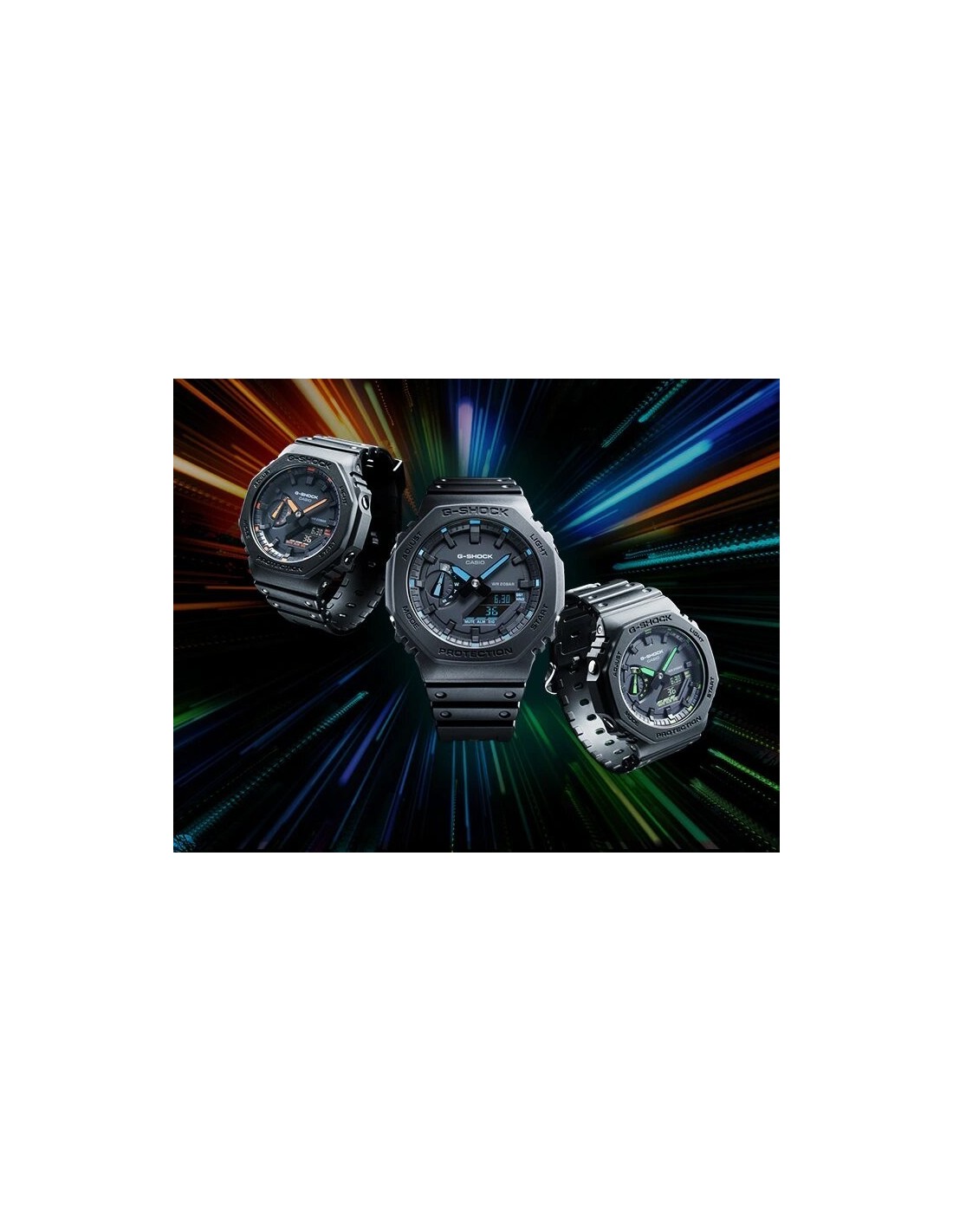Con un fondo negro mate, esta versión del popular modelo GA-2100 resalta el dial de naranja consiguiendo un acabado único.