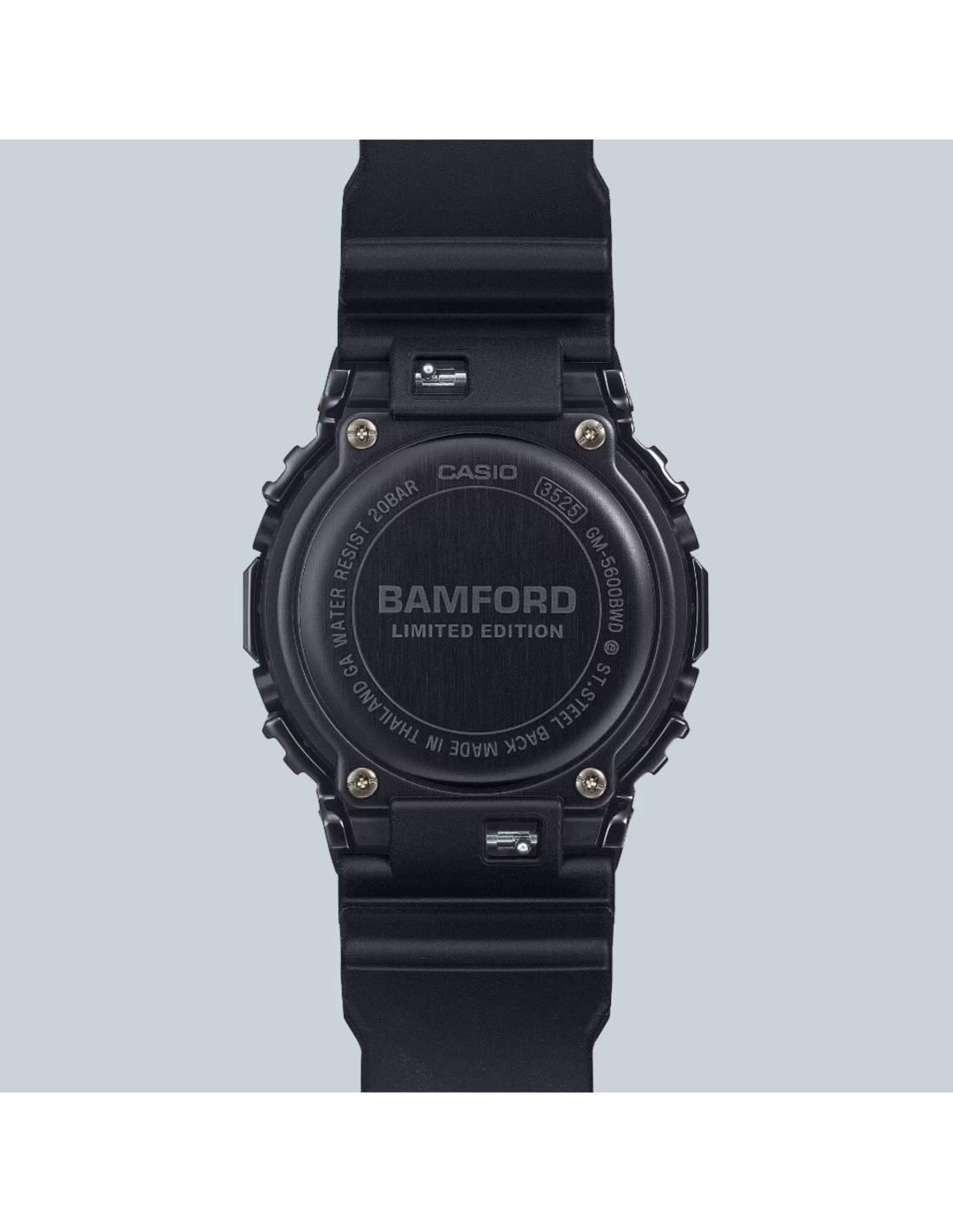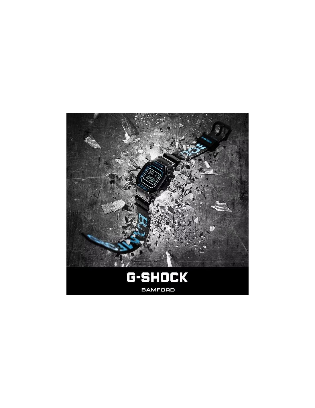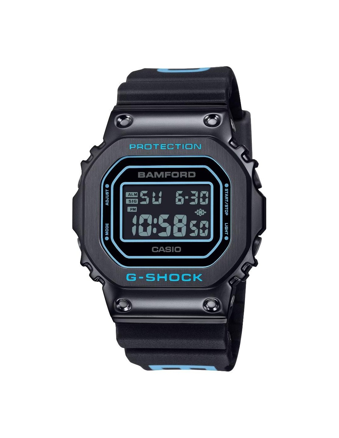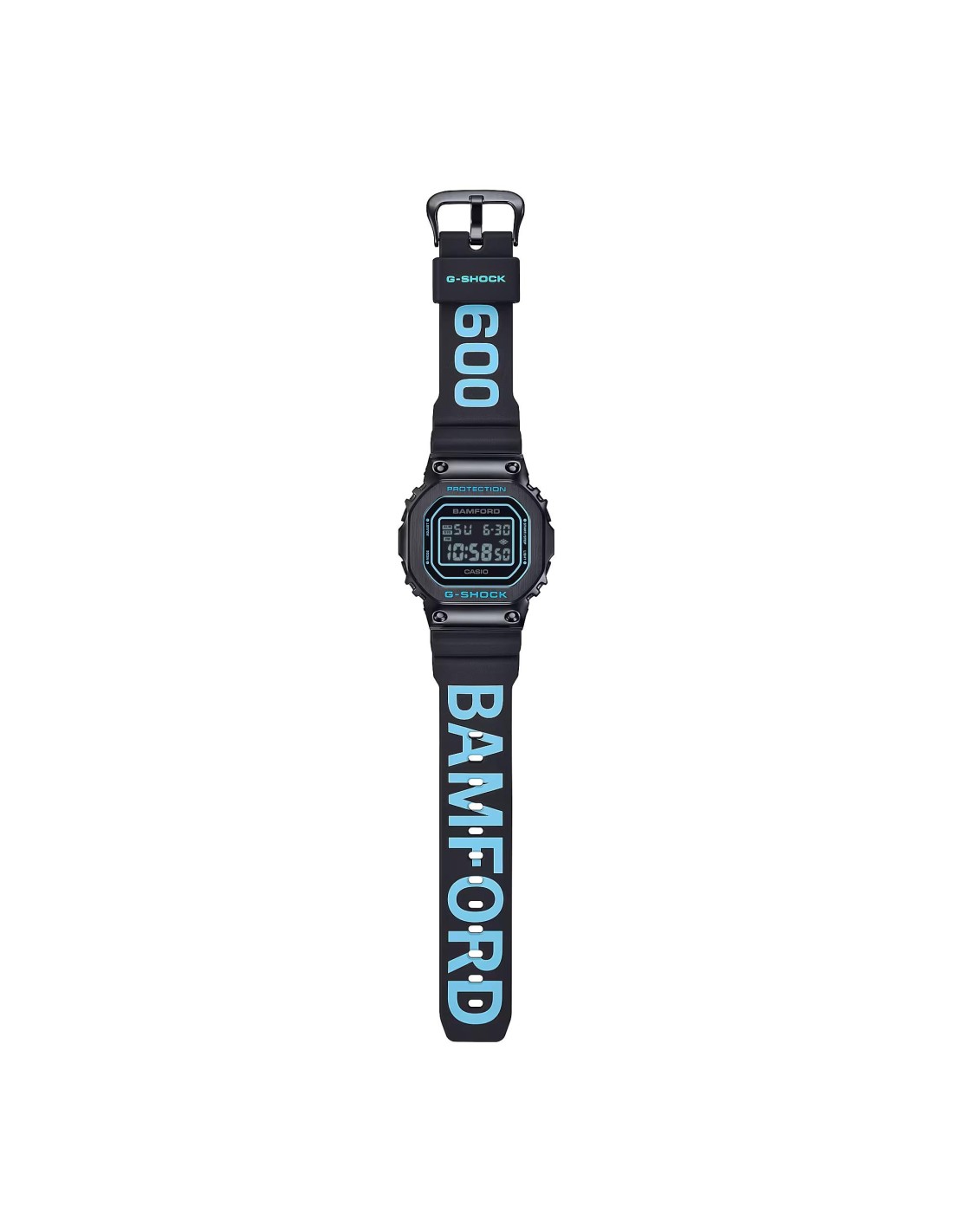 Este modelo parte del clásico GM-5600, destacando su robusto bisel metálico en acabado negro. Sobre esta base, el característico azul aguamarina de Bamford se integra en todo el diseño: presente en la correa, la pantalla y los sutiles detalles del bisel. El contraste con los componentes metálicos con recubrimiento iónico negro crea una estética elegante, moderna y altamente distintiva.