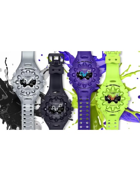 El exterior combina formas orgánicas con líneas bien definidas, una gran pantalla LCD completa y una esfera metalizada que refuerza su carácter audaz. Su innovadora manecilla de liberación de impactos refleja el compromiso de G-SHOCK con una durabilidad sin límites.