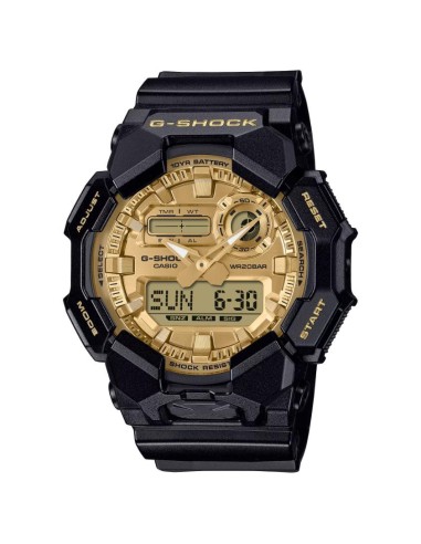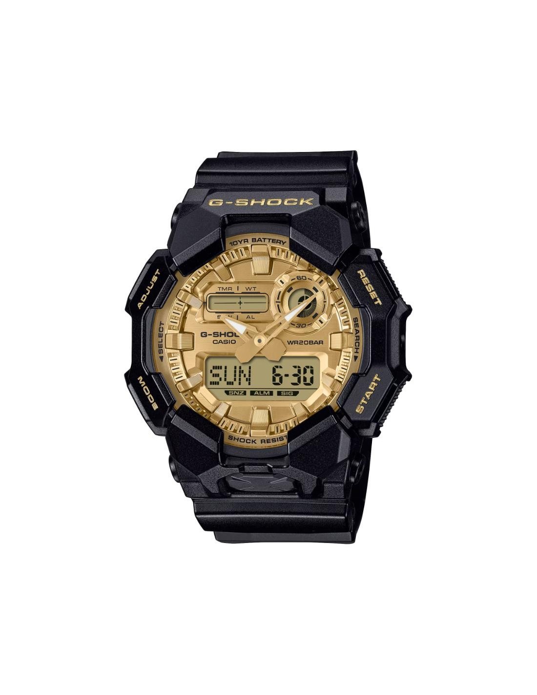 El cuerpo completamente negro, tan resistente como esperas de un G-SHOCK, se realza con detalles dorados y acabados espejados que le dan un look atrevido, potente y con mucho estilo. La esfera brilla gracias a la deposición de vapor en dorado, mientras que la pantalla LCD con acabado espejo complementa su diseño sofisticado. La caja y la correa lucen un acabado brillante que aporta un toque extra de presencia.