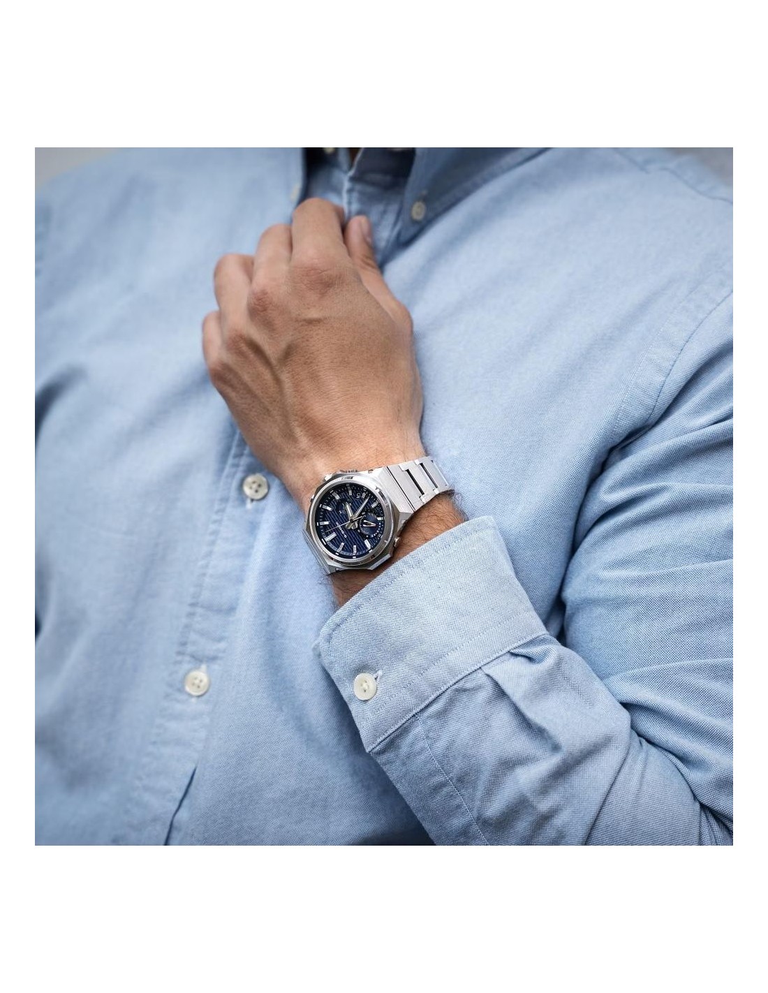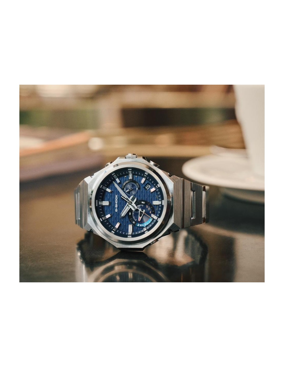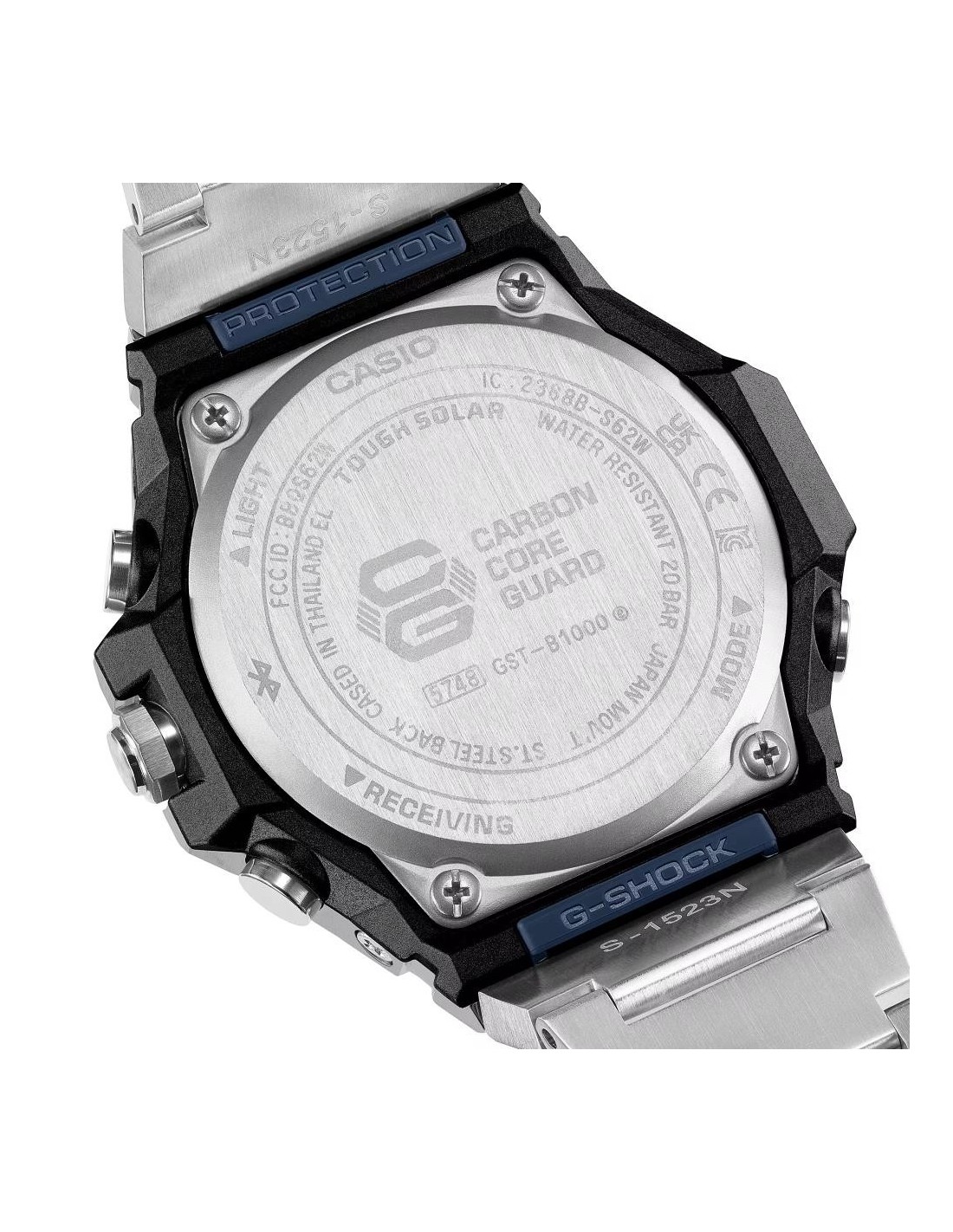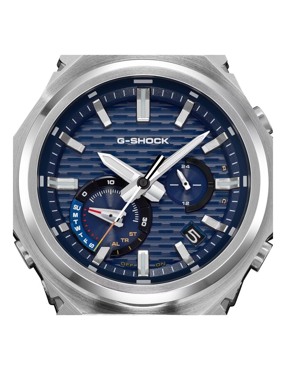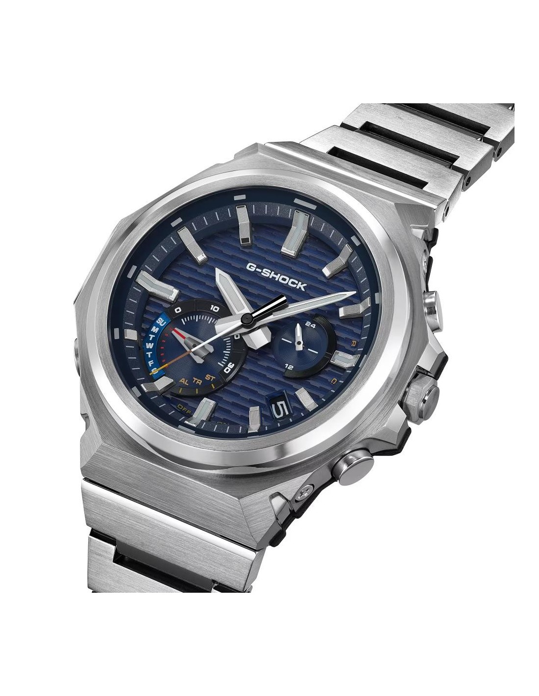 El GST-B1000D reinterpreta la esencia de G-SHOCK con una construcción robusta, acabados refinados y un diseño limpio sin logotipo en el bisel. Sus tres texturas metálicas —rayado vertical, rayado circular y pulido espejo— aportan una presencia sofisticada que cambia con la luz. La correa y el cierre de acero inoxidable macizo completan un aspecto elegante y versátil para cualquier ocasión.