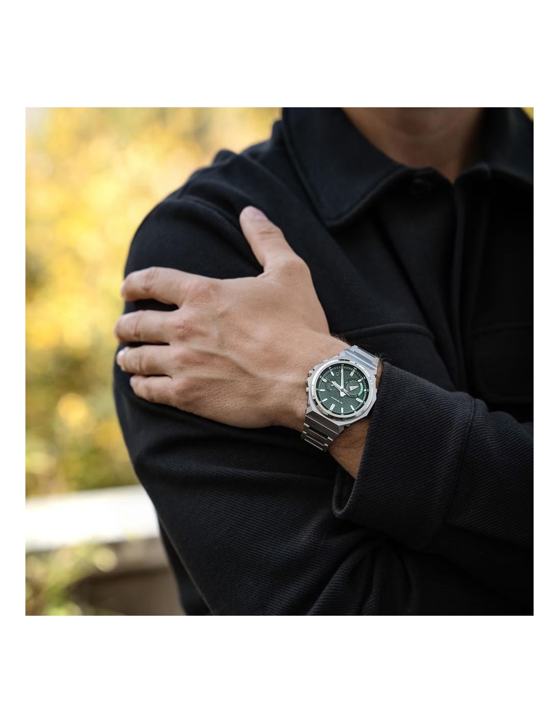 El GST-B1000D reinterpreta la esencia de G-SHOCK con una construcción robusta, acabados refinados y un diseño limpio sin logotipo en el bisel. Sus tres texturas metálicas —rayado vertical, rayado circular y pulido espejo— aportan una presencia sofisticada que cambia con la luz. La correa y el cierre de acero inoxidable macizo completan un aspecto elegante y versátil para cualquier ocasión.