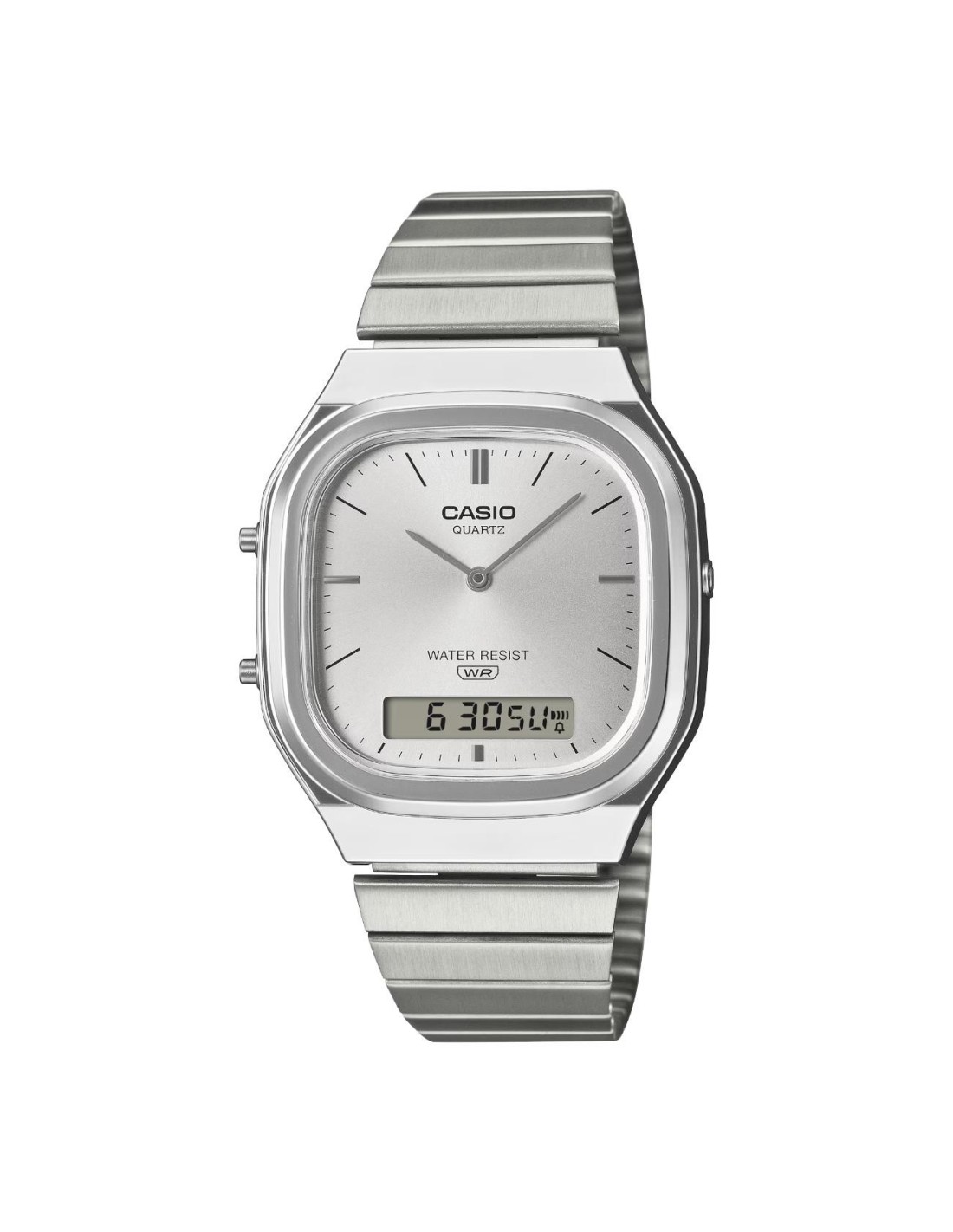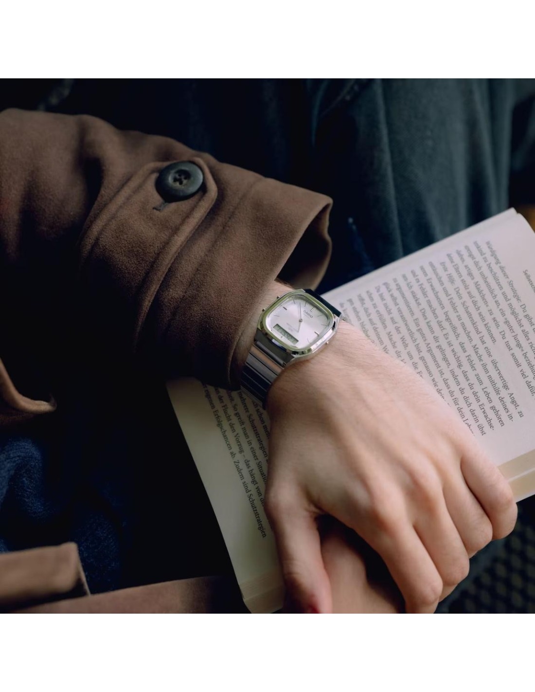 Este modelo analógico-digital combina dos pantallas en un diseño retro-moderno irresistible. Su esfera ligeramente rectangular, enmarcada por una caja de líneas suaves y curvas metálicas, transmite elegancia y refinamiento.