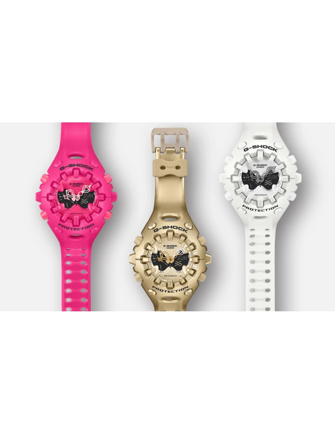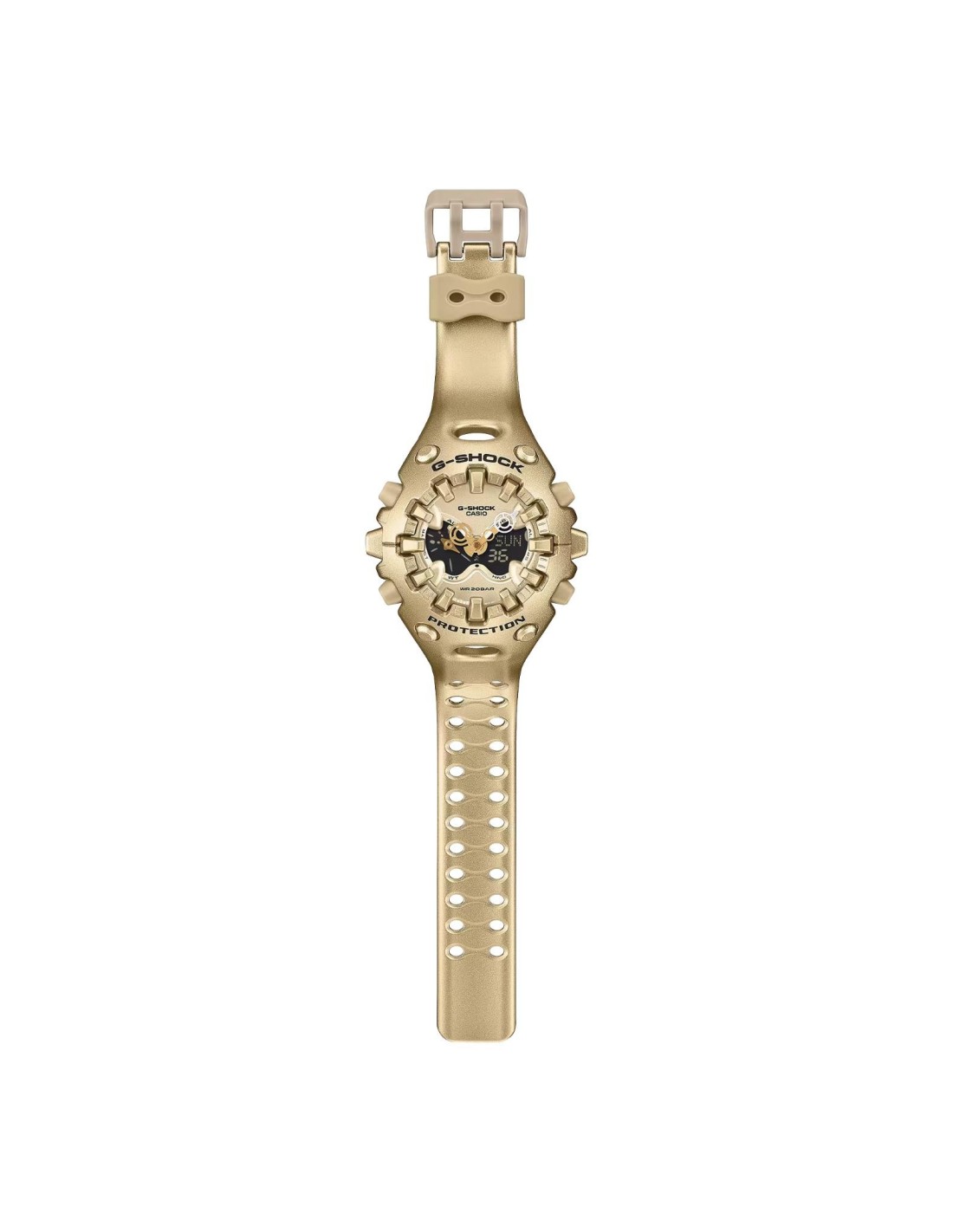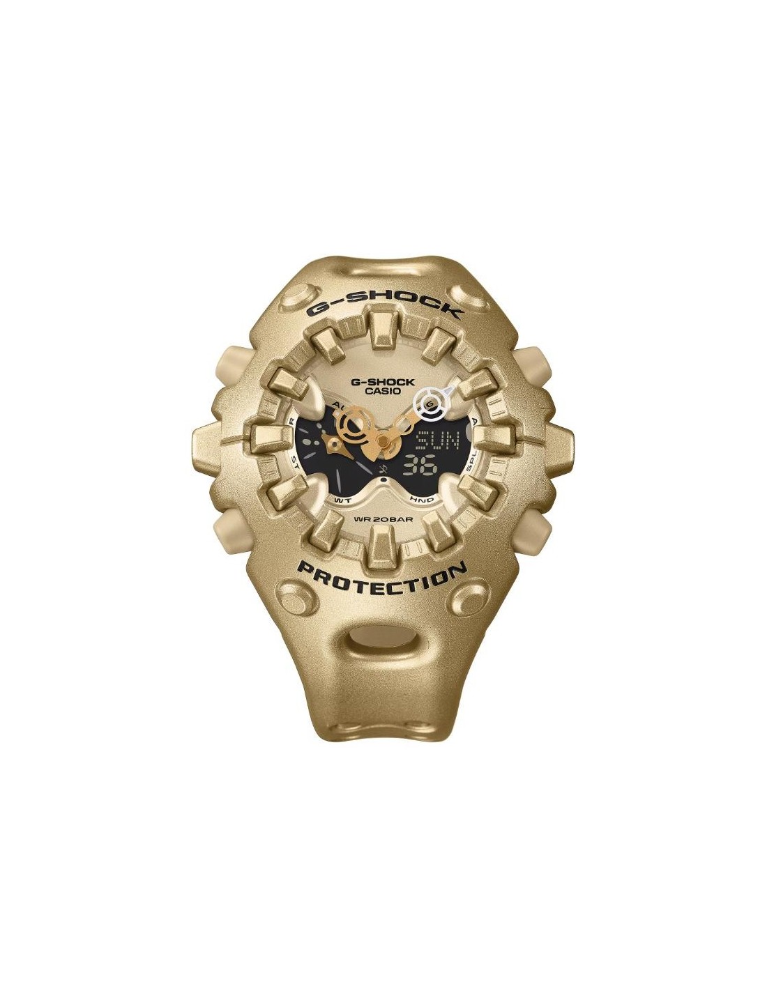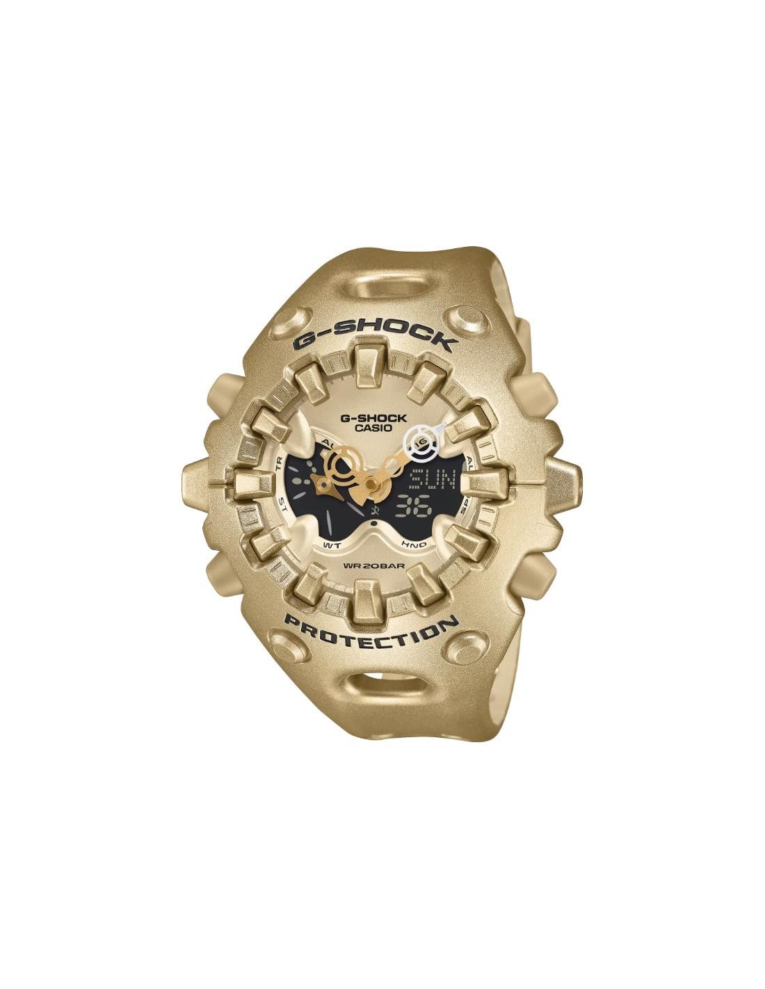 El exterior combina formas orgánicas con líneas bien definidas, una gran pantalla LCD completa y una esfera metalizada que refuerza su carácter audaz. Su innovadora manecilla de liberación de impactos refleja el compromiso de G-SHOCK con una durabilidad sin límites.