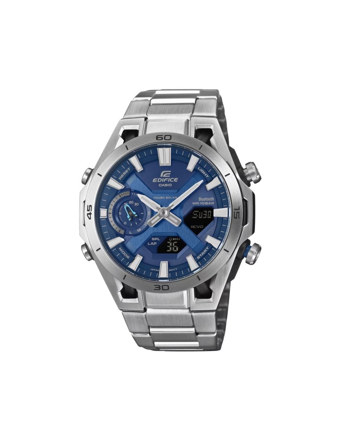 Más allá de su impactante estética, el ECB-2300 destaca por su alto nivel funcional. La conectividad Bluetooth® permite el emparejamiento con el smartphone para la corrección automática de la hora y la configuración sencilla de alarmas, hora mundial y otras funciones desde la aplicación. Incorpora además Tough Solar para un suministro de energía fiable, cristal de zafiro resistente a los arañazos, resistencia al agua de 10 bar y un conjunto de prestaciones pensadas para acompañarte en cualquier situación.