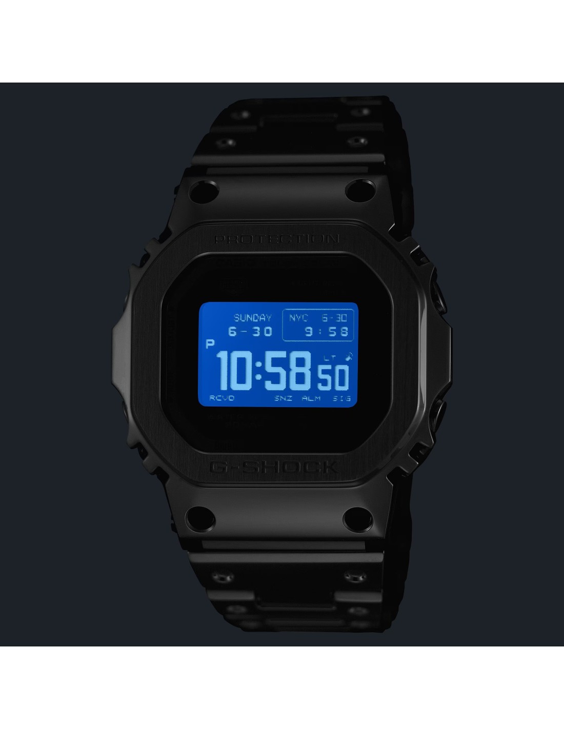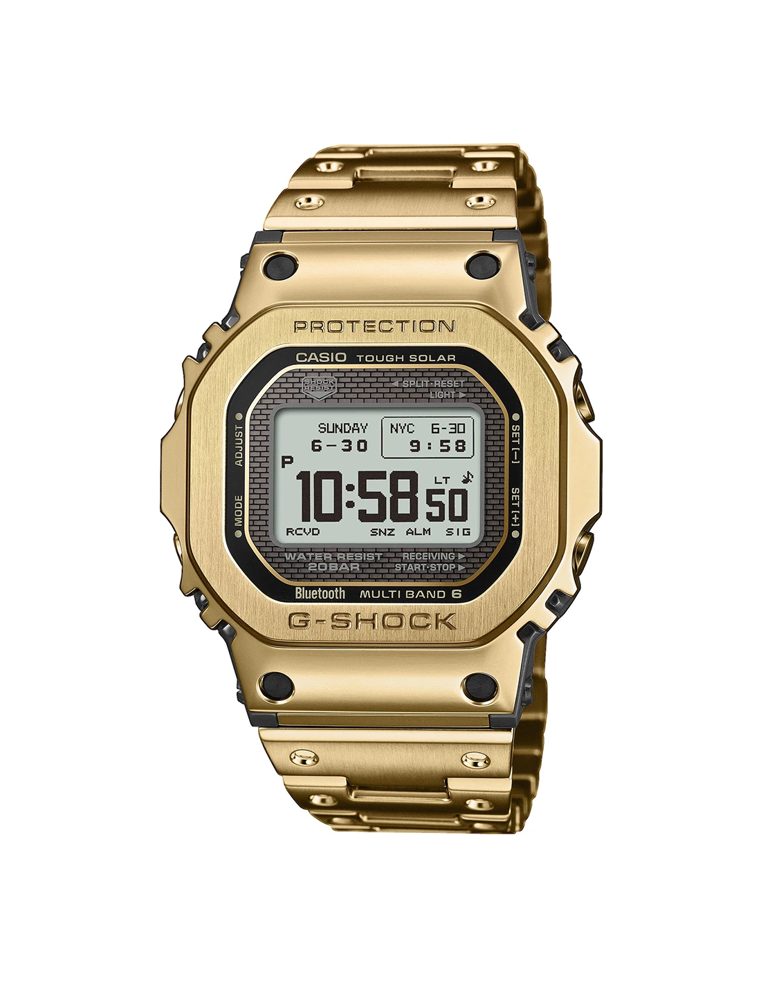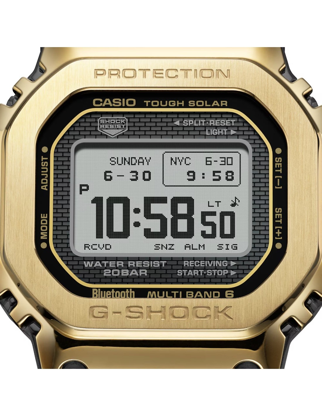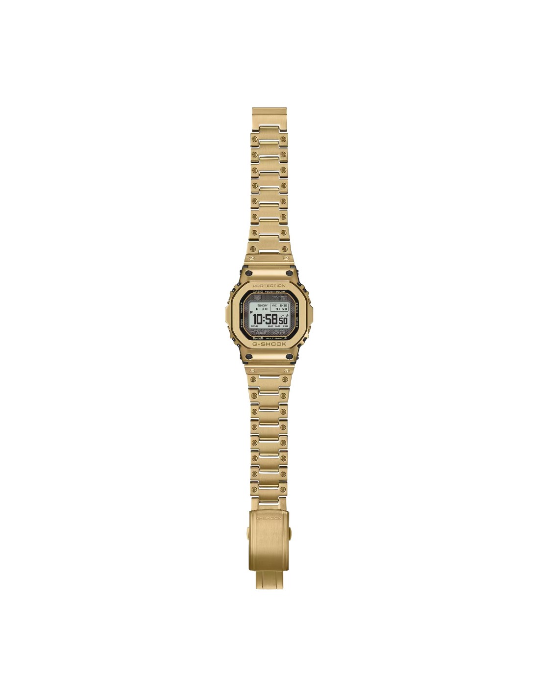 El diseño de la pantalla en el modo de hora mantiene el aspecto del primer G-SHOCK, con un estilo tradicional y una funcionalidad avanzada. A través de la aplicación CASIO WATCHES puedes emparejarlo con tu smartphone mediante Bluetooth®. Con la Multibanda 6, el sistema de carga Tough Solar y la luz LED de gran luminosidad, tendrás toda la utilidad práctica al alcance de la mano.