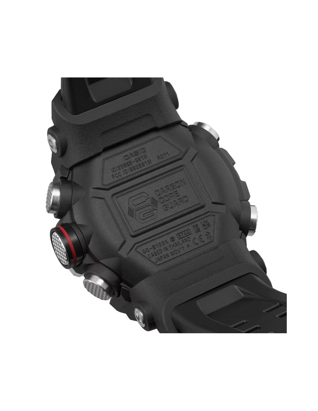 El GG-B100 MUDMASTER incorpora carbono de alta rigidez en la carcasa para mantener a raya daños y deformaciones, garantizando un alto nivel de estanqueidad y resistencia a los golpes. También incluye un filtro que impide la entrada de barro, un panel trasero de acero inoxidable y una cubierta trasera de resina fina resistente a los golpes, reforzada con fibras de vidrio, ofreciendo máxima protección contra polvo y barro. Los principales componentes de la caja y la correa están fabricados con resina de base biológica, producida a partir de recursos orgánicos renovables para reducir el impacto medioambiental.