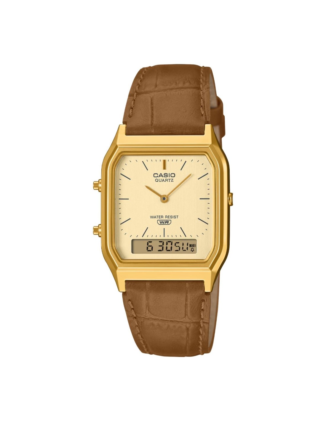 Inspirado en el icónico modelo AQ-230, este reloj combina un look sofisticado con funciones prácticas para tu día a día: resistencia al agua, cronómetro, alarma y más herramientas que facilitan tu rutina. Su clásico diseño de correa texturizada añade un toque atemporal que se adapta tanto a estilos casuales como formales.