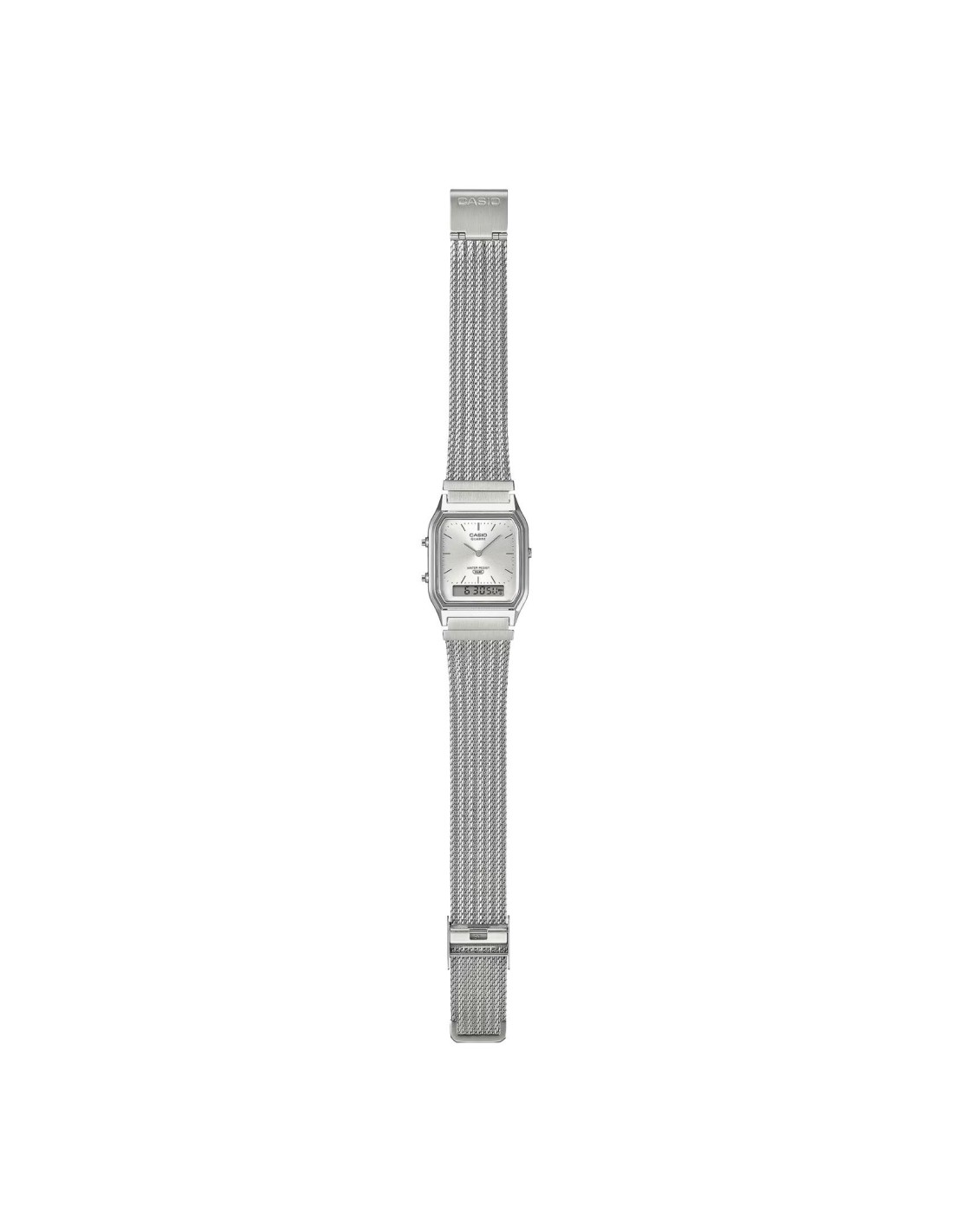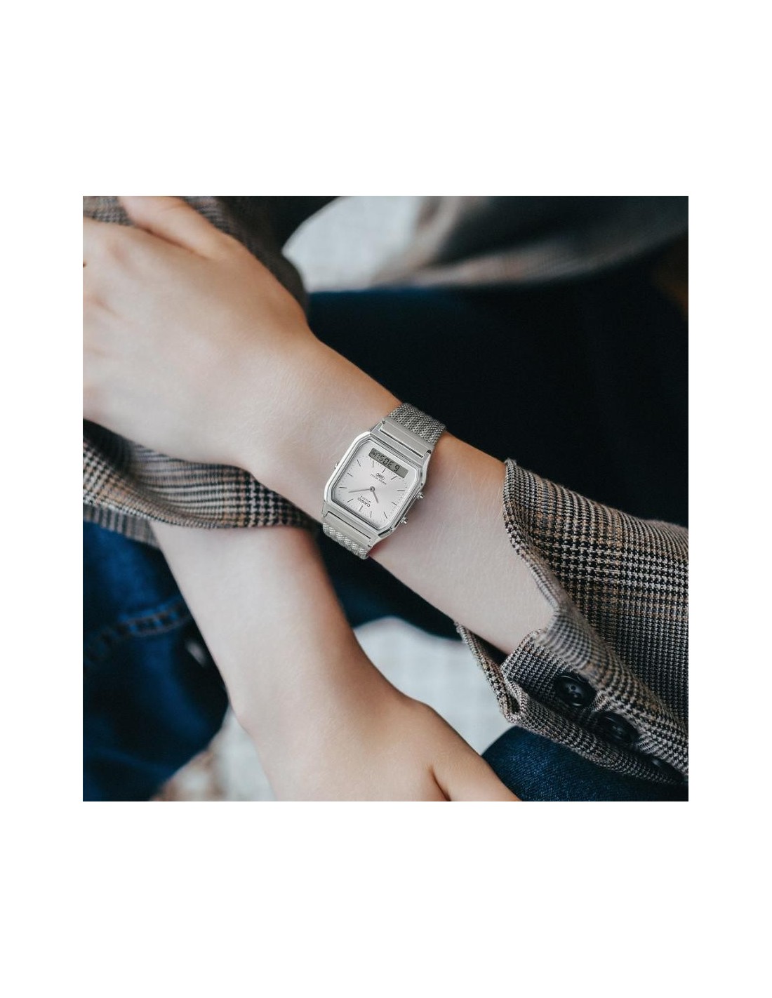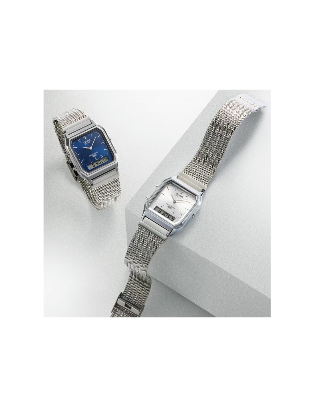 Redescubre un clásico reinventado. El icónico modelo analógico-digital AQ-230 se actualiza con una elegante esfera angular y una sofisticada correa de malla fina.