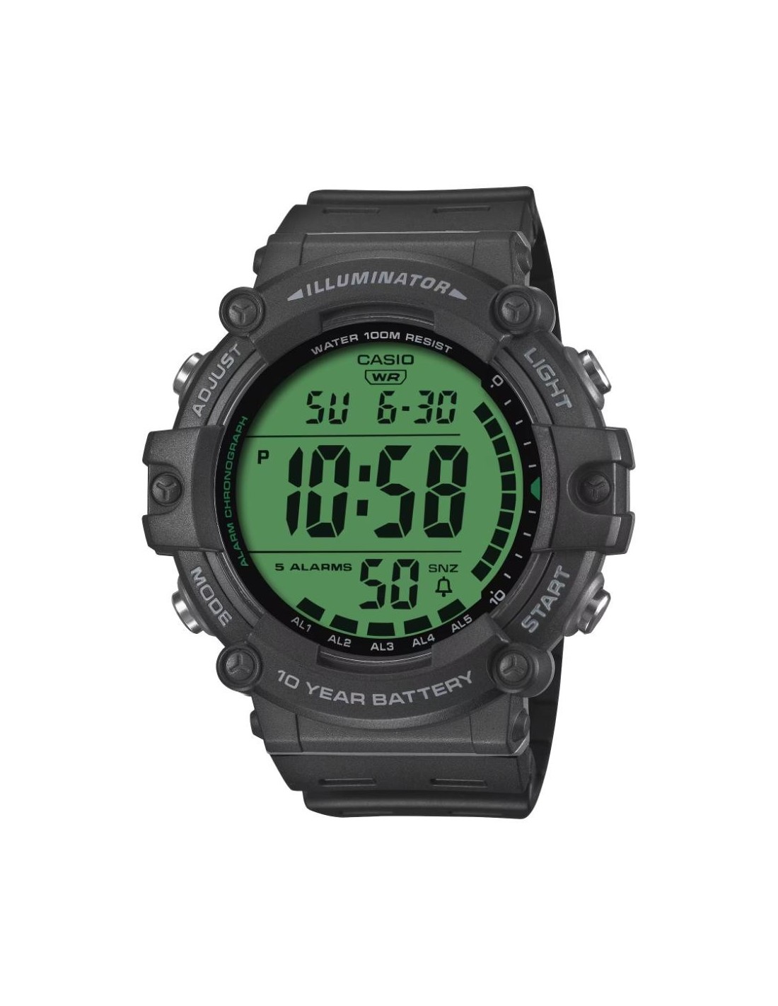 It offers water resistance up to 10 bar, a battery life of approximately ten years, LED backlighting and practical functions such as a stopwatch, alarm and other utilities that make it a reliable companion for everyday use.