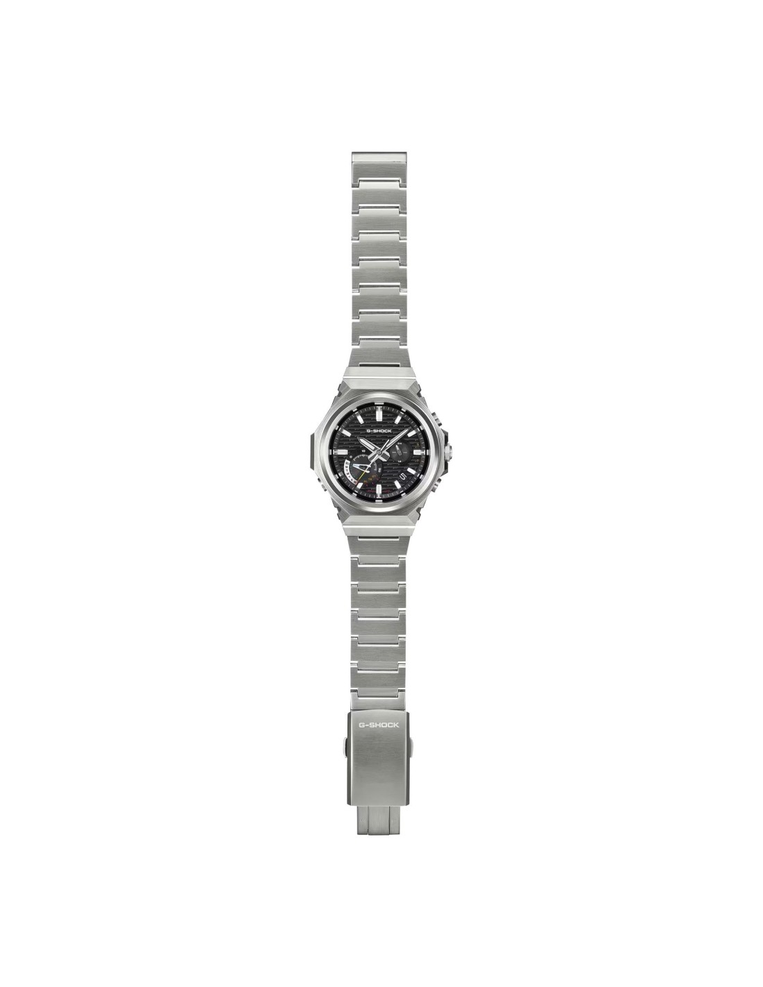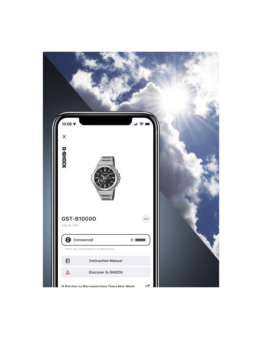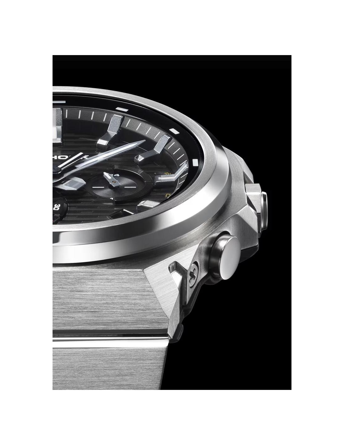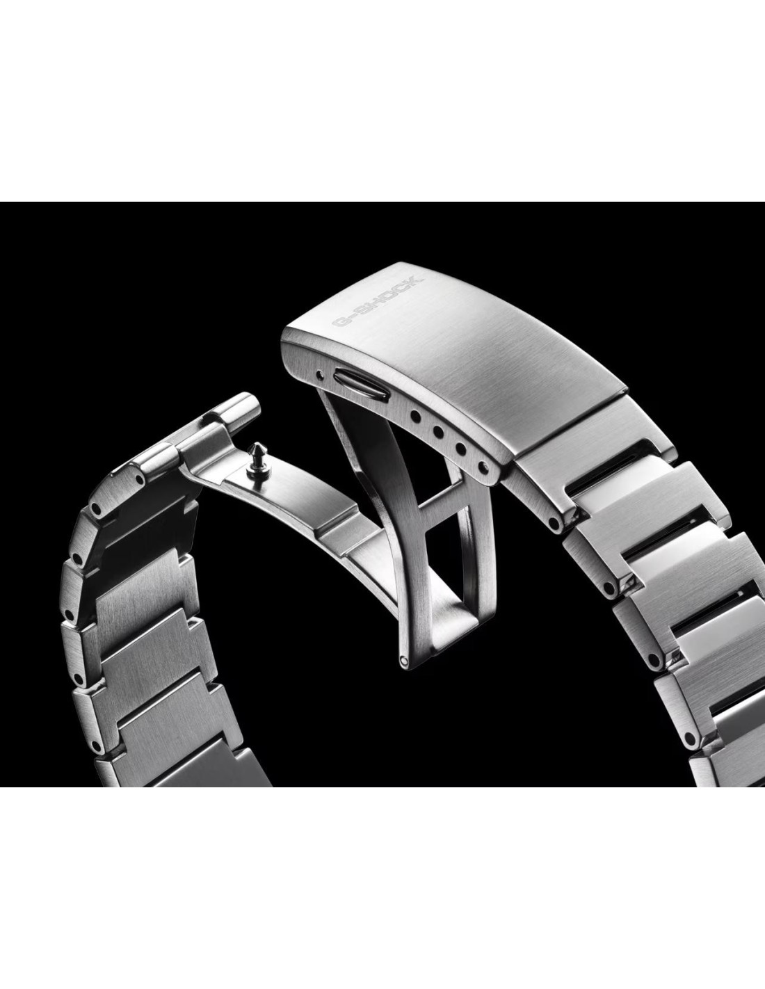 The GST-B1000D reinterprets the essence of G-SHOCK with a robust construction, refined finishes and a clean design without a logo on the bezel. Its three metallic textures — vertical scratch, circular scratch and mirror polish — lend a sophisticated presence that changes with the light. The solid stainless steel strap and clasp complete an elegant and versatile look for any occasion.