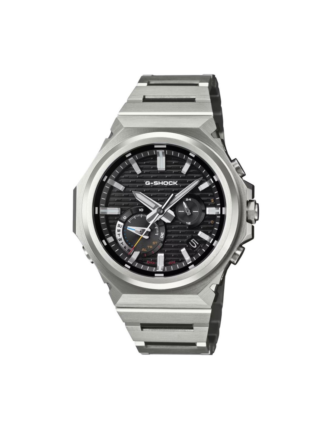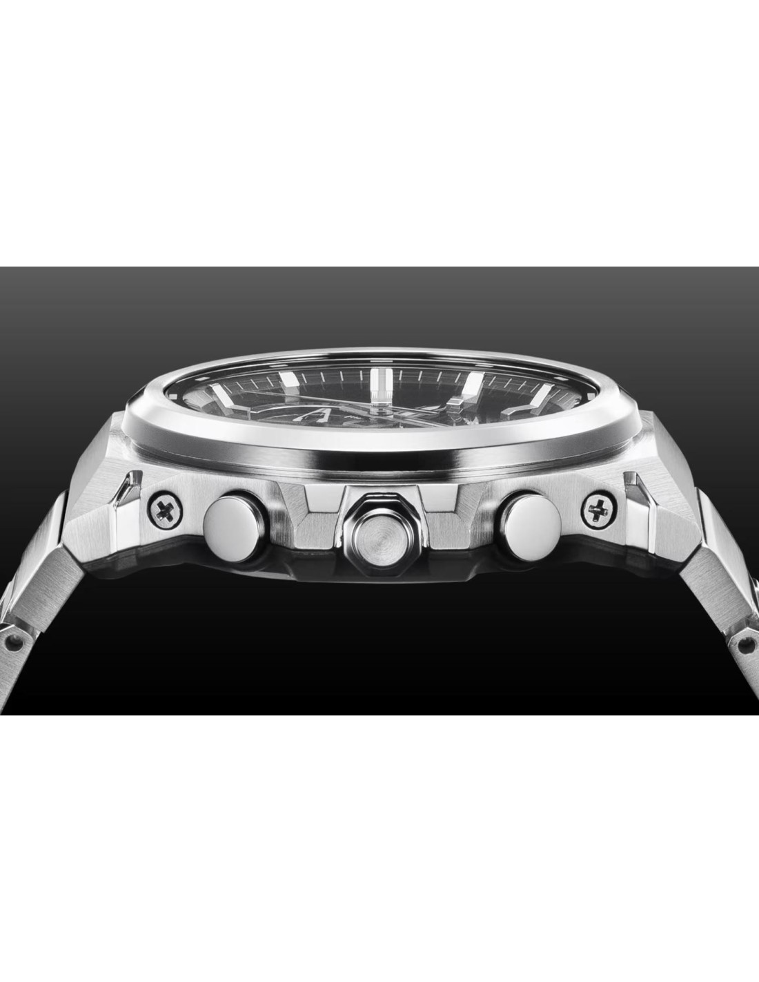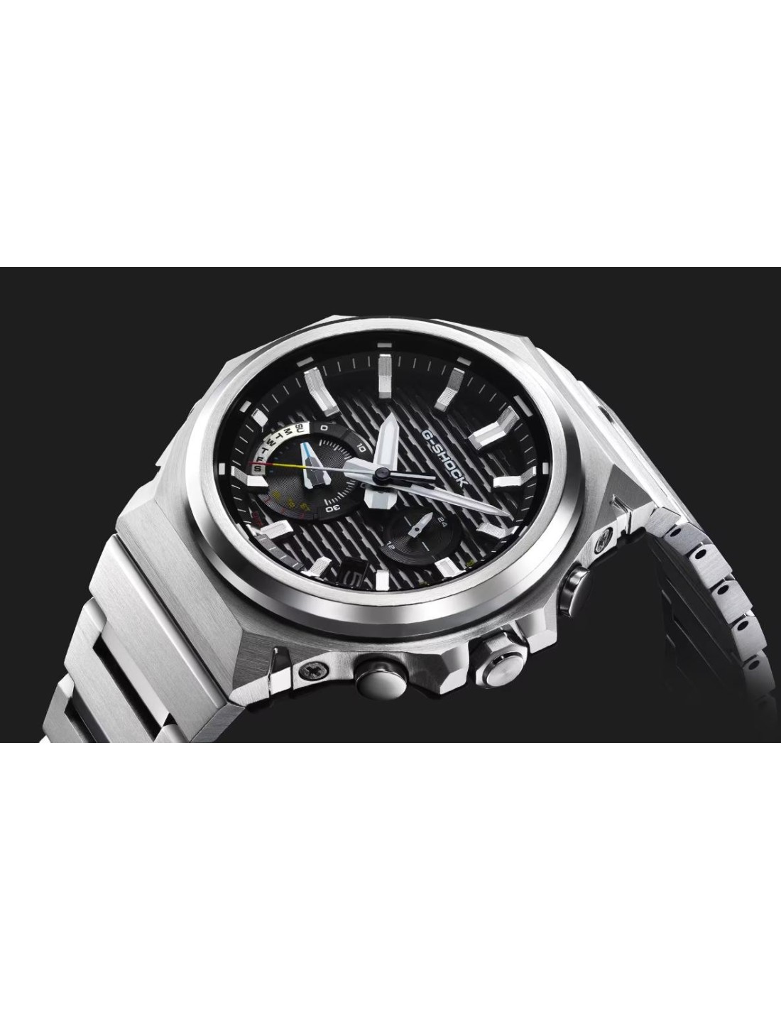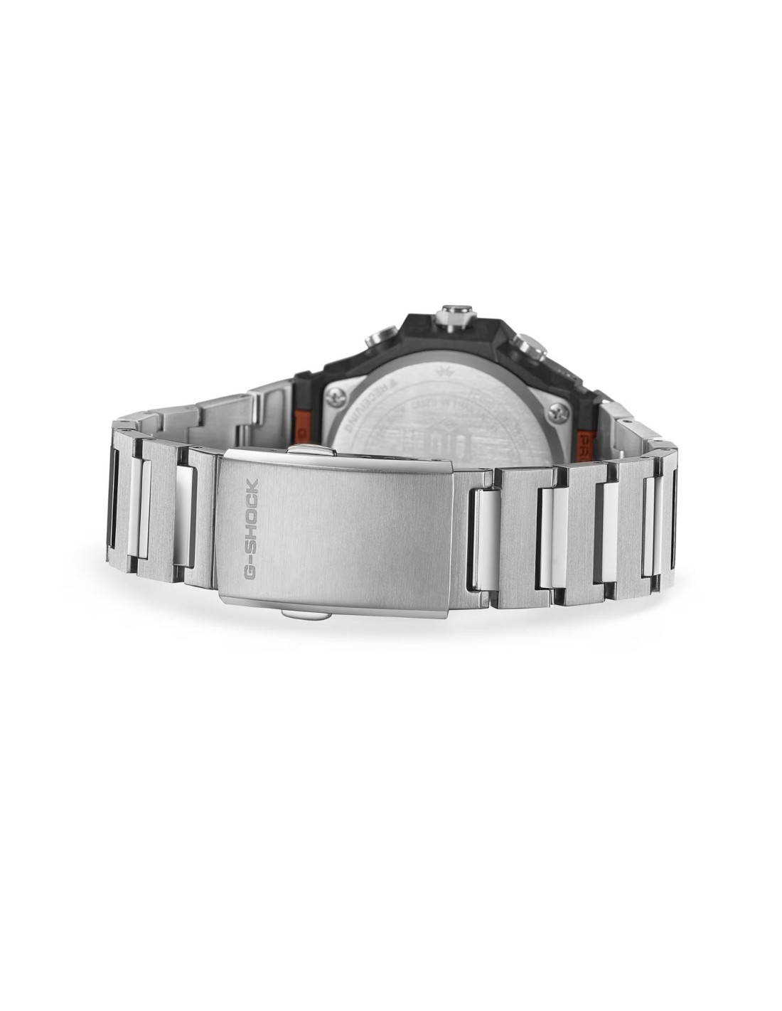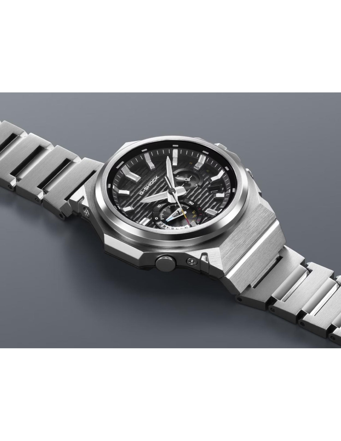 The GST-B1000D reinterprets the essence of G-SHOCK with a robust construction, refined finishes and a clean design without a logo on the bezel. Its three metallic textures — vertical scratch, circular scratch and mirror polish — lend a sophisticated presence that changes with the light. The solid stainless steel strap and clasp complete an elegant and versatile look for any occasion.