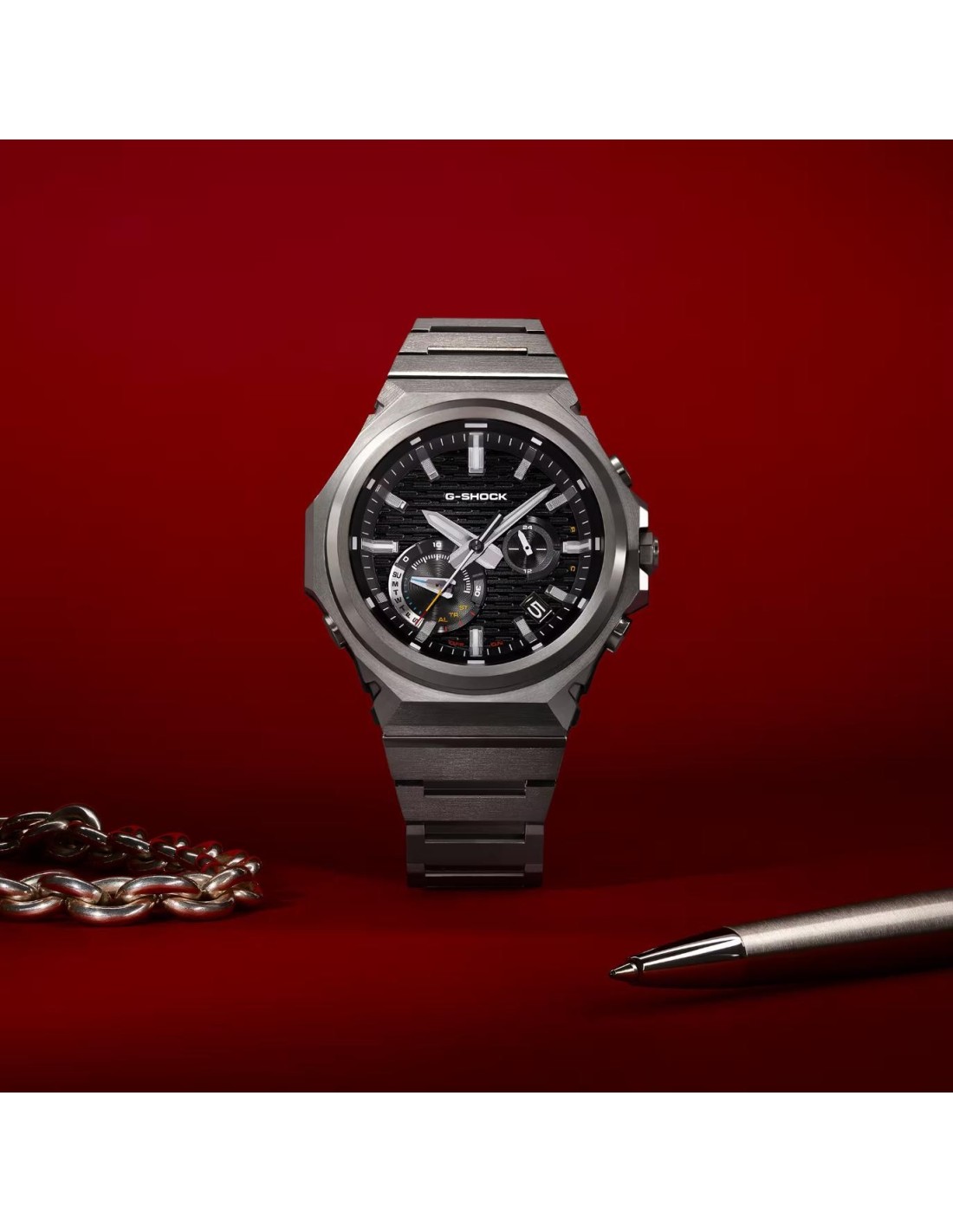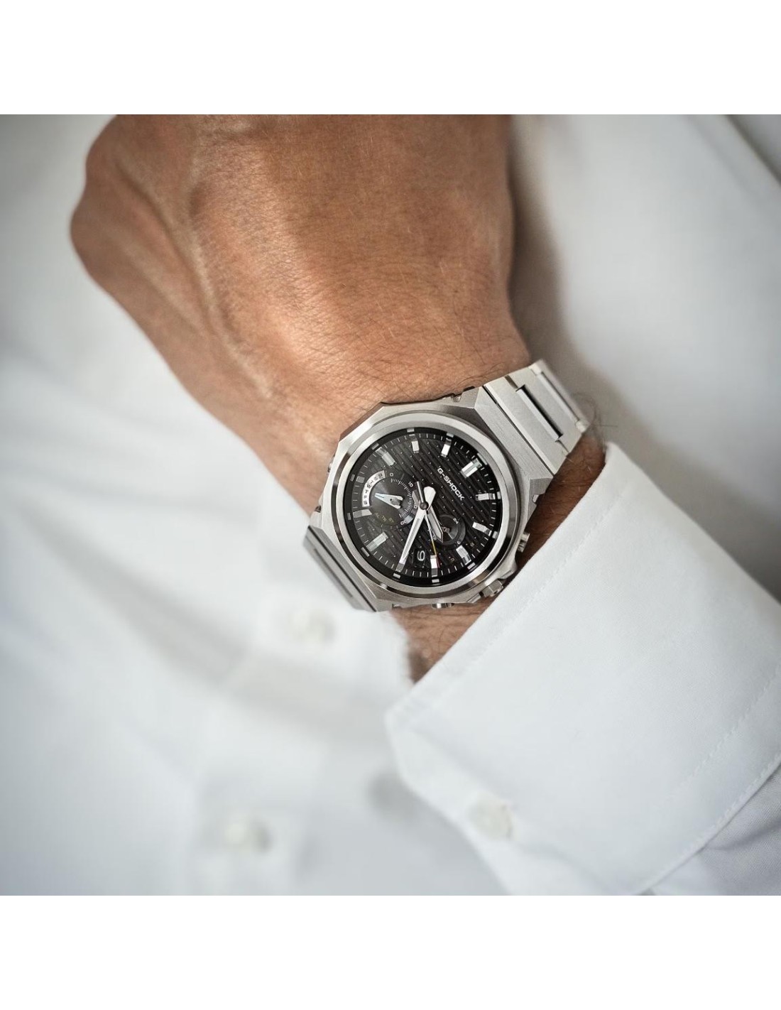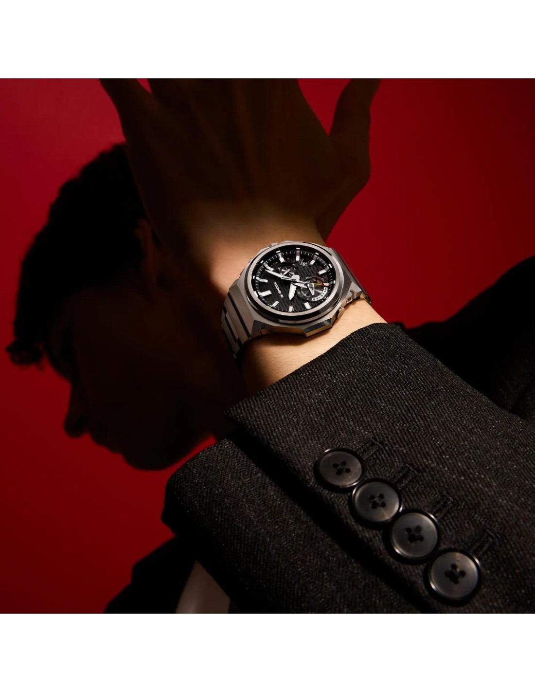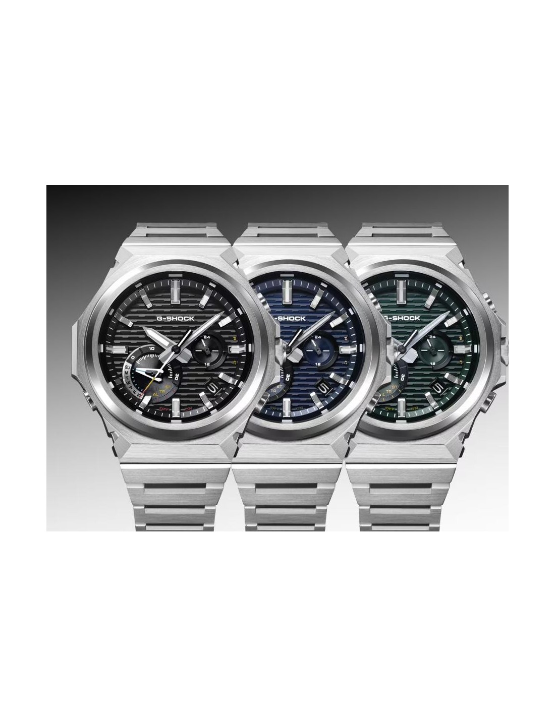 The GST-B1000D reinterprets the essence of G-SHOCK with a robust construction, refined finishes and a clean design without a logo on the bezel. Its three metallic textures — vertical scratch, circular scratch and mirror polish — lend a sophisticated presence that changes with the light. The solid stainless steel strap and clasp complete an elegant and versatile look for any occasion.