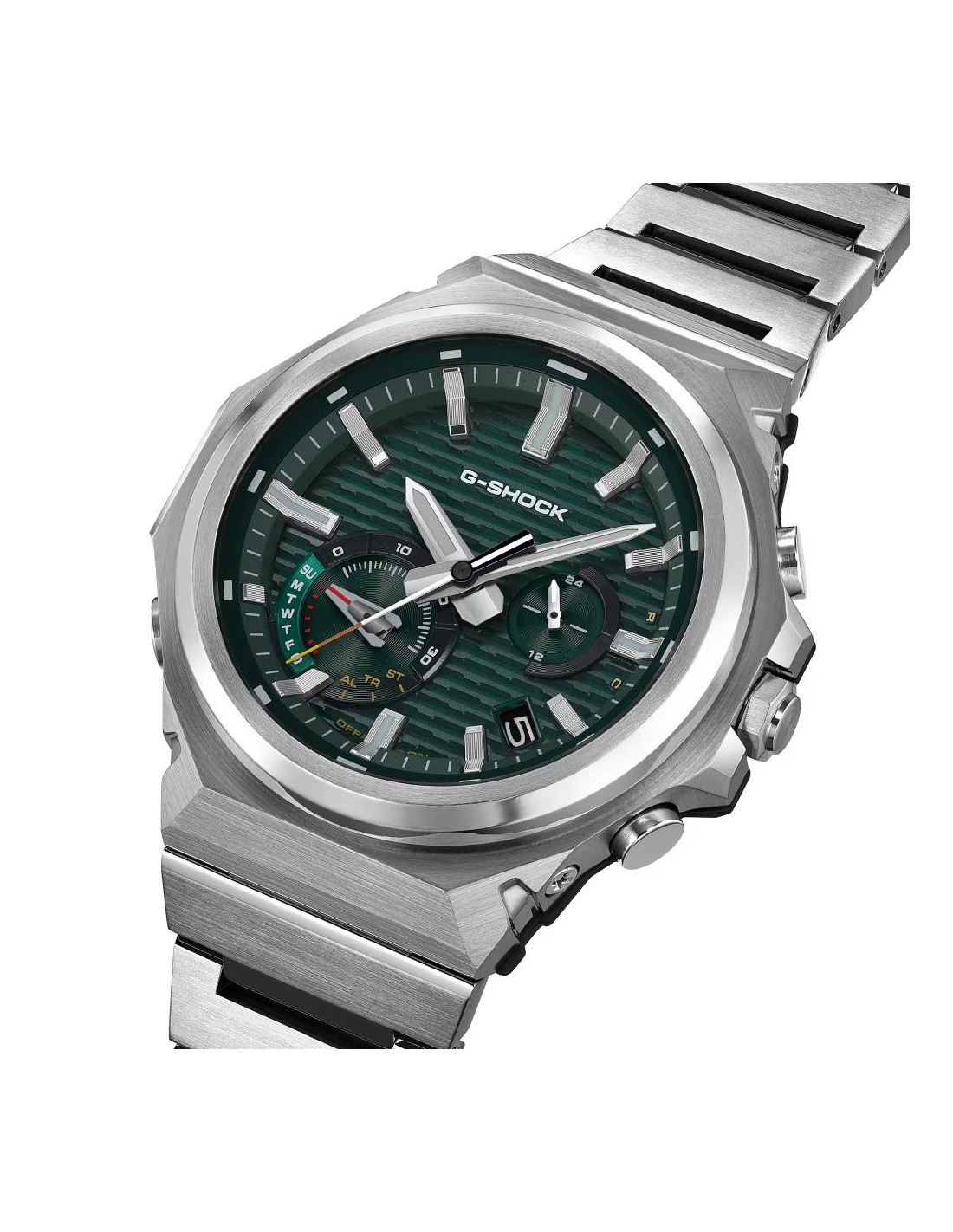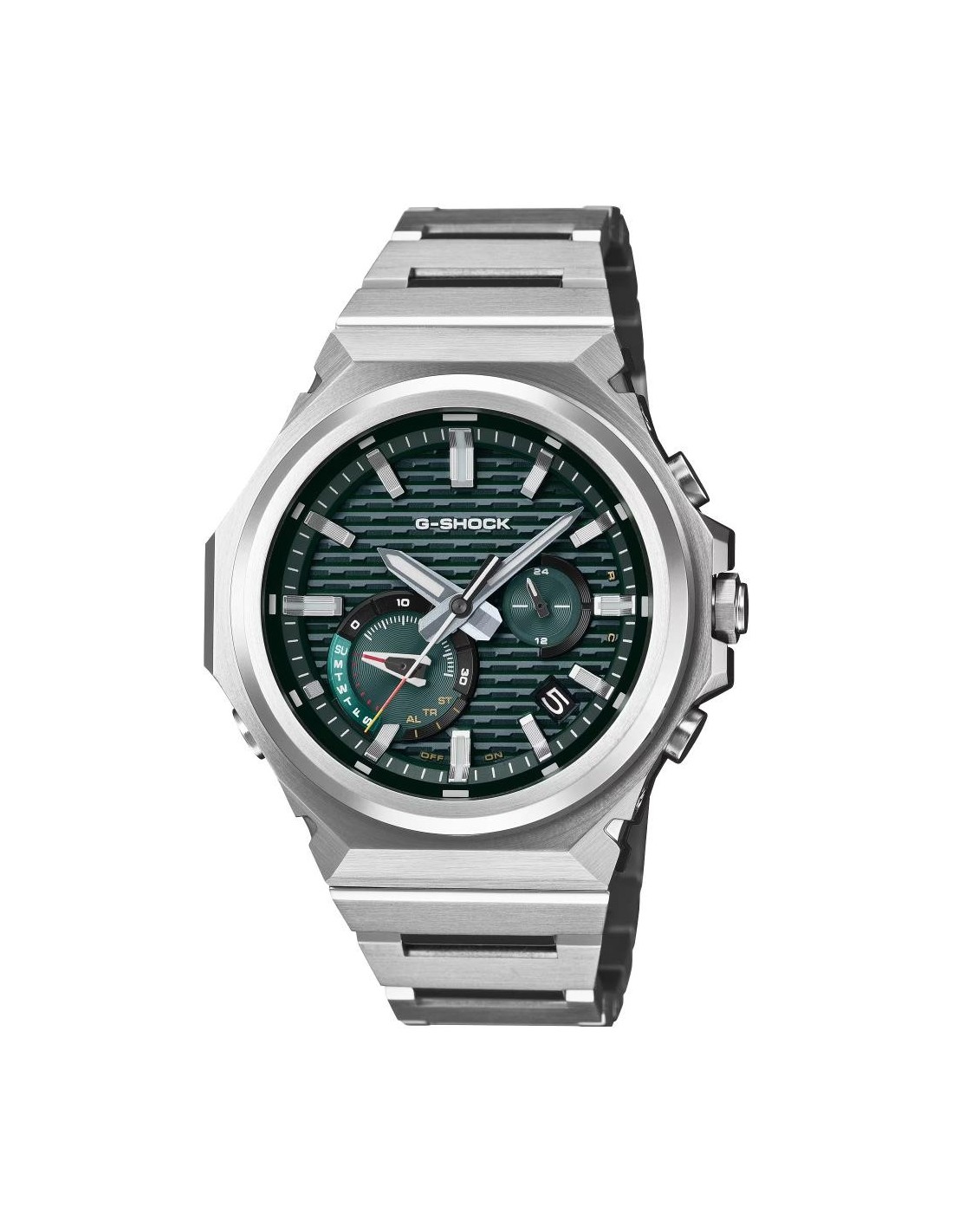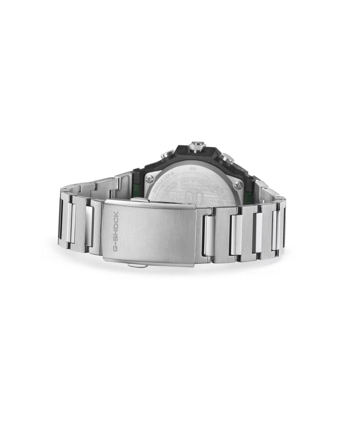 The GST-B1000D reinterprets the essence of G-SHOCK with a robust construction, refined finishes and a clean design without a logo on the bezel. Its three metallic textures — vertical scratch, circular scratch and mirror polish — lend a sophisticated presence that changes with the light. The solid stainless steel strap and clasp complete an elegant and versatile look for any occasion.