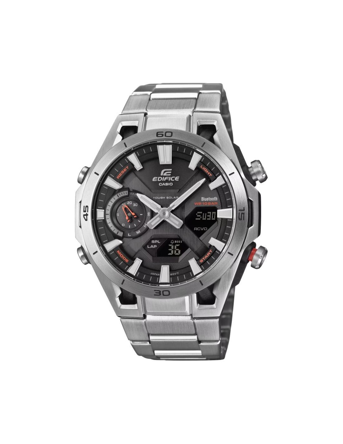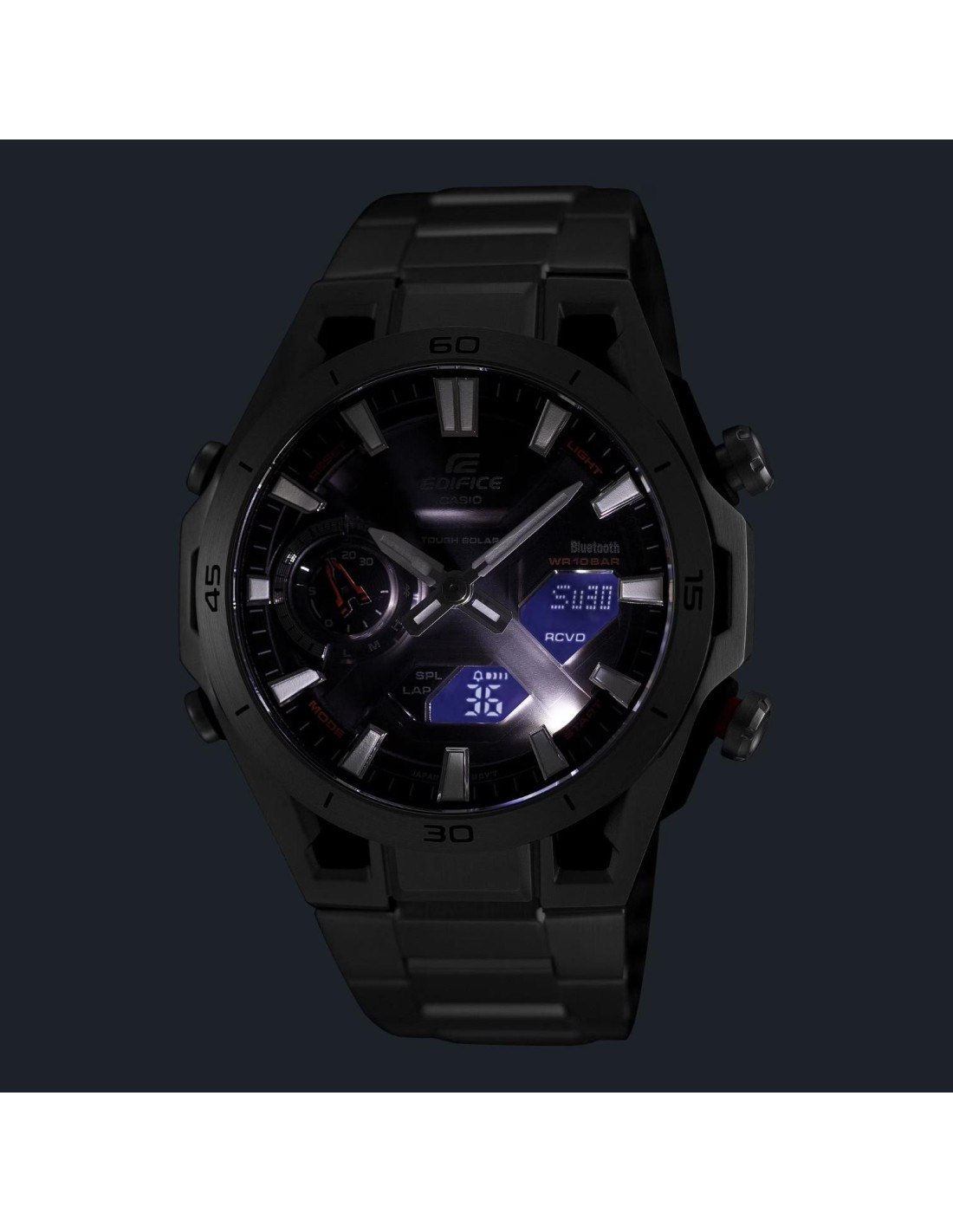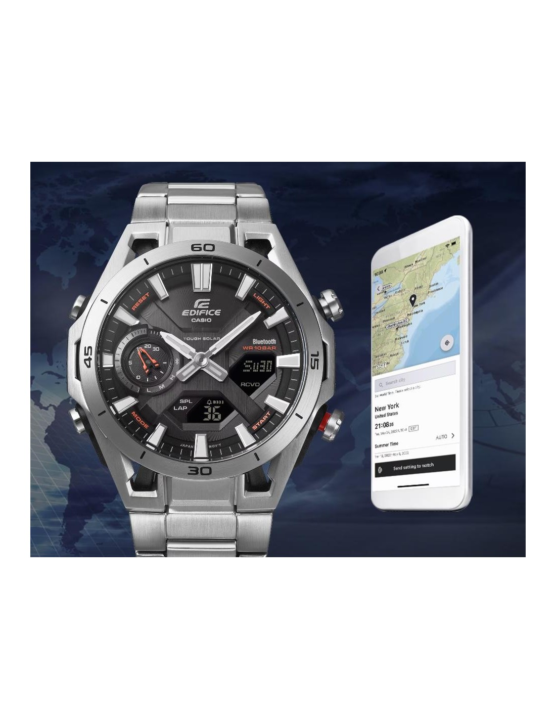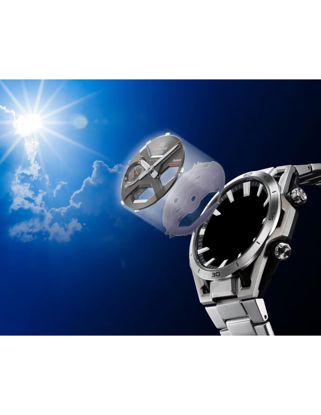 Beyond its striking aesthetics, the ECB-2300 stands out for its high level of functionality. Bluetooth® connectivity allows pairing with a smartphone for automatic time correction and easy setting of alarms, world time and other functions from the app. It also features Tough Solar for reliable power supply, scratch-resistant sapphire crystal, 10 bar water resistance and a range of features designed to accompany you in any situation.