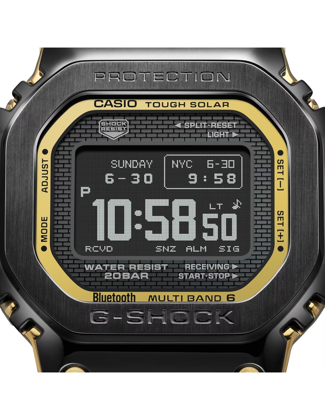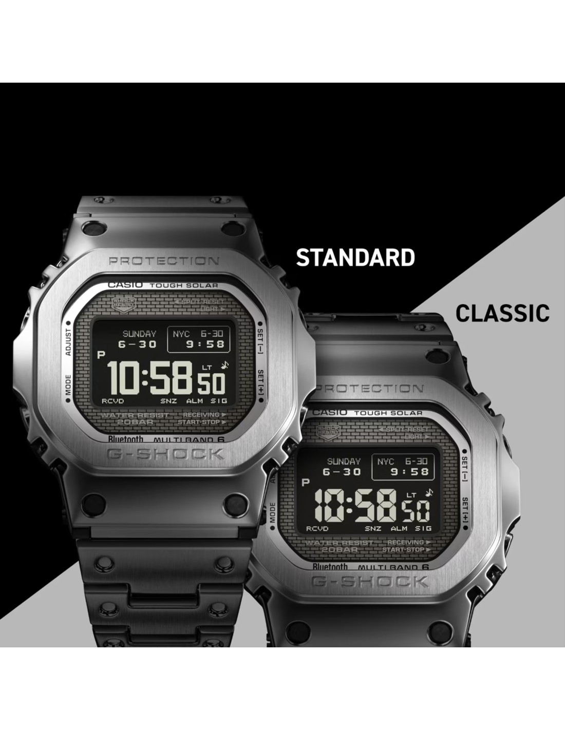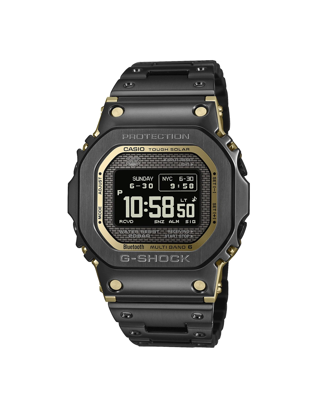 The display design in time mode retains the look of the first G-SHOCK, with traditional styling and advanced functionality. Using the CASIO WATCHES app, you can pair it with your smartphone via Bluetooth®. With Multi-Band 6, the Tough Solar charging system and high-brightness LED light, you'll have all the practical utility you need at your fingertips.